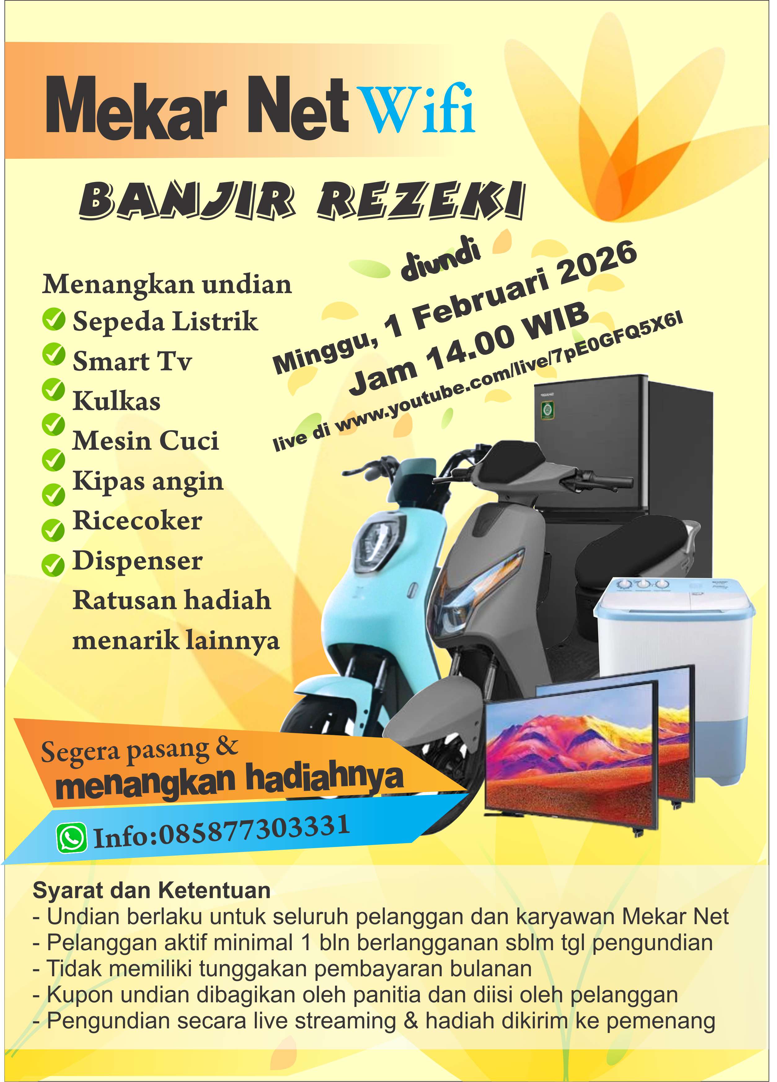 Undian berhadiah mekar net akan diselenggarakan pada hari Minggu 1 Februari 2026 pukul 14.00 dan disiarkan live melalui kanal Youtube pada link berikut ini https://www.youtube.com/live/7pE0GFQ5X6I